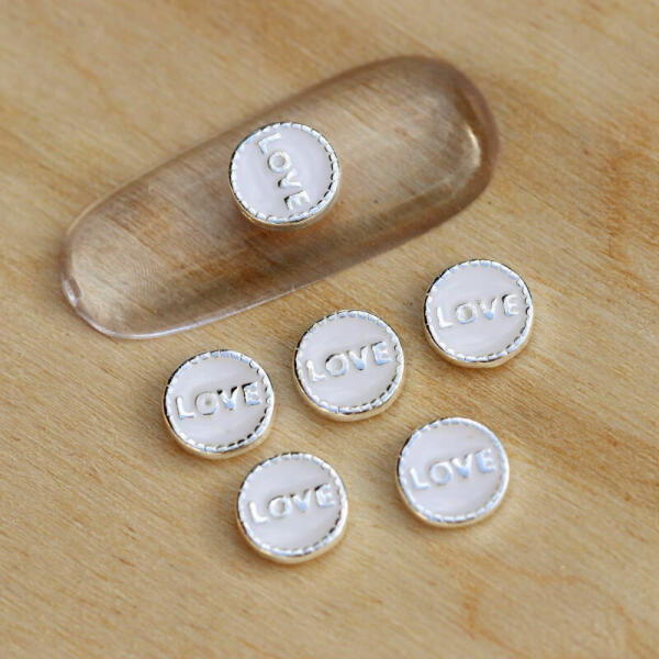 6mm-es kerek lapos dísz. Fehér, "Love" felirattal. 8db/cs.