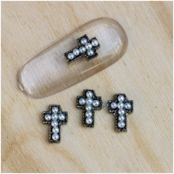 Zodiac körömdekoráció grafit alapon fehér színű félgyöngyökkel díszített kereszt. Nagyszerűen kombinálható szépen vágott koreai félgyöngyeinkkel. Glue gél segítségével egyszerűen rögzíthető.