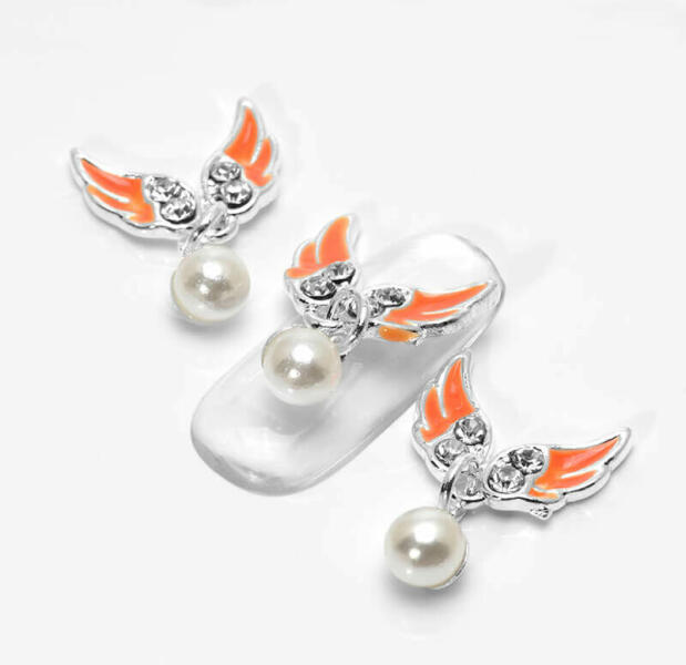 Strasszköves körömdísz, nagy, 13mm-es angyalszárny függő gyönggyel, strasszkövekkel díszítve.