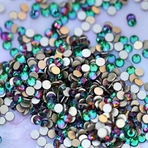 Zodiac strasszkő ss8 méretben Vitrail Medium színben. Alap színében élénk zöld, oldalról nézve lilás színvilágra vált. Flatback no hotfix típusú ragasztható strasszkő. Fedezed fel hasonló színvilágú üveg formáinkat is! Hogyan díszítsünk strasszkövekkel? A nagyobb méretű, lapos talpú kövek felhelyezéséhez használj pillanatragasztót (tipp: UHU gél állagú ragasz