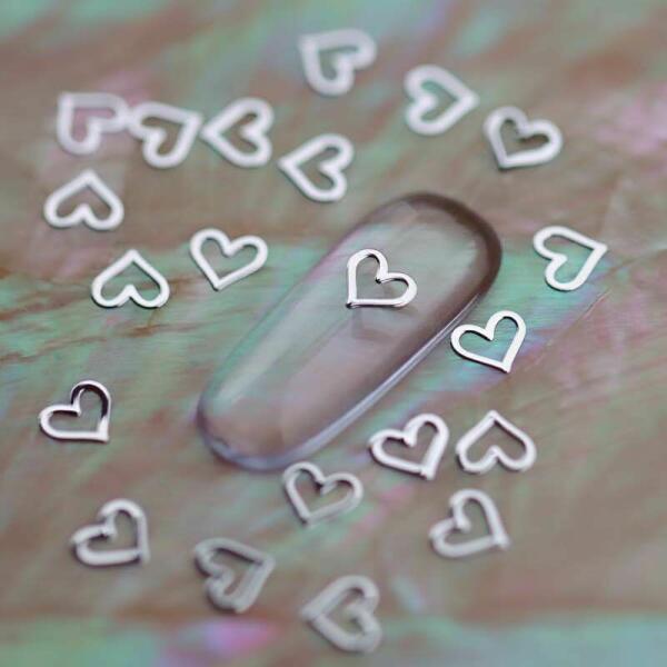 Metál körömdíszítő lemez, ezüst színű, könnyen hajlítható, szív formában. Kis méretének köszönhetően variálható egyedi díszítéseinknél, gél lakkba is használható, beépíthető.
