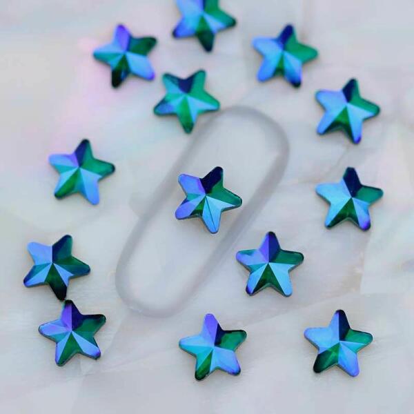 Strassz formakő csillag körömdísz. Kékes-zöldes színvilága különleges megjelenést biztosít. Flatback ragasztható üvegdísz, mely nagyszerű díszítő a karácsonyi hangulathoz. Glue gél segítségével egyszerűen rögzíthető.