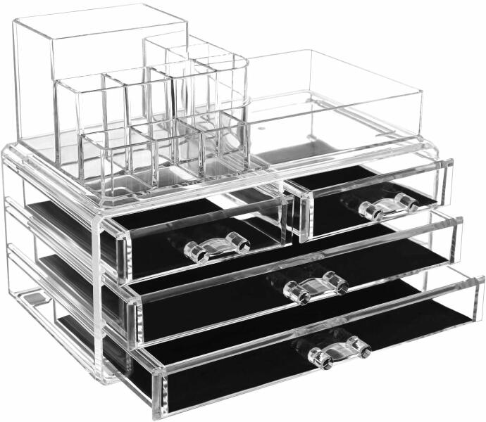 sminkrendező, kozmetikai rendszerező, egymásra rakható, akril tok 11 rekesszel, 4 fiókkal, fésülködőasztalhoz, mosdópult a hálószobában, fürdőszoba, ajándékötlet, átlátszó [Nagy kapacitás] A felső réteg 11 különböző méretű rekesszel rúzsokhoz és sminkecsetekhez, alatta pedig 4 fiókkal a pirosítók, púderek és alapozók számára – minden napi kozmetikuma gondo