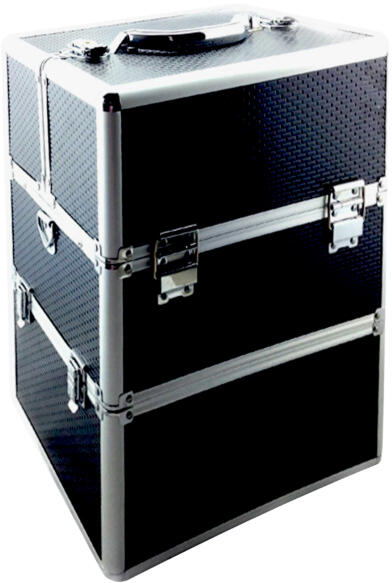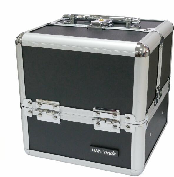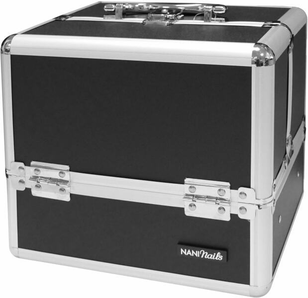 NANI széthajtható kozmetikai bőrönd kozmetikai kellékekre és készítményekre. A masszív alumíniumszerkezet rendkívül tartós, mégis könnyű. Fekete bársonnyal bélelt belső, beleértve a két rekeszt. A kivehető felső résznek köszönhetően rendkívül kompakt; zselé és gél lakk rendszerezőkkel. Paraméterek: megerősített sarkak kulcsos zár kivehető belső belső rekesz