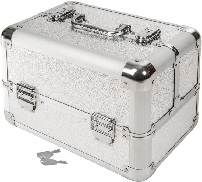 NANI széthajtható kozmetikai bőrönd kozmetikai kellékekre és készítményekre. A masszív alumíniumszerkezet rendkívül tartós, mégis könnyű. A kivehető felső résznek köszönhetően rendkívül kompakt; zselé és gél lakk rendszerezőkkel. Paraméterek: megerősített sarkak kulcsos zár kivehető belső belső rekeszek kivehető rendszerezőkkel Méretek: a bőrönd méretei 23