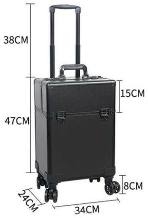 Kozmetikai műanyag görgős bőrönd, tárolókkal. A profi többfunkciós kozmetikai bőröndben kényelmesen szállíthatod, praktikusan, igényesen tárolhatod a kozmetikai alapanyagaidat, eszközeidet, kellékeidet. A bőrönd méretei: Szélesség: 34 cm Hosszúság: 24 cm Magasság: 47 cm
