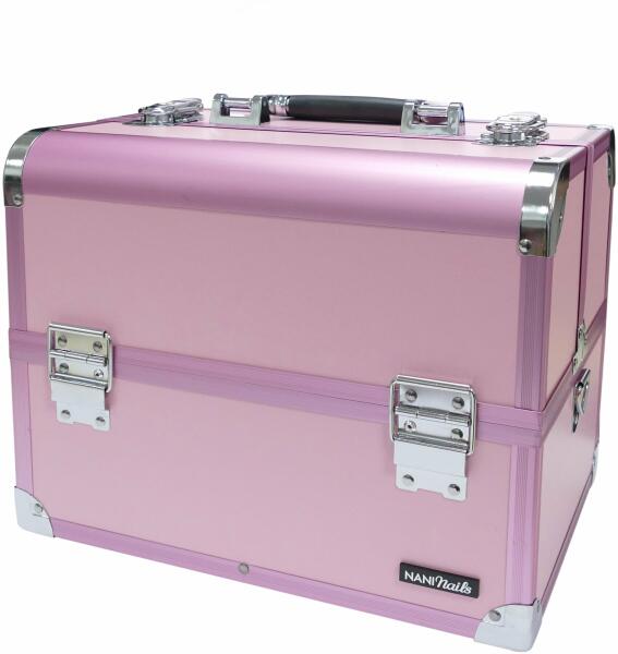 NANI széthajtható kozmetikai bőrönd kozmetikai kellékekre és készítményekre. A masszív alumíniumszerkezet rendkívül tartós, mégis könnyű. A kivehető felső résznek köszönhetően rendkívül kompakt; zselé és gél lakk rendszerezőkkel. Paraméterek: megerősített sarkak kulcsos zár Méretek: a bőrönd méretei 330 x 225 x 220 mm (sz x mé x ma) felső rész belseje 190 x