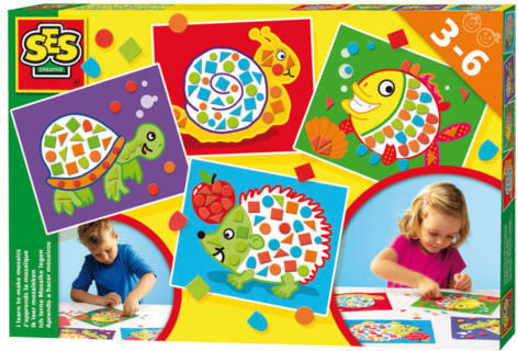 Tedd fel a mozaiklapokat a színes rajzokra! A SES Már tudom mozaikot készíteni készletben négyzet, háromszög, kör formájú színes matricákat tartalmaz, amikkel csigát, teknőst, halat és sünit ábrázoló képeket tudsz színesebbé tenni. A kis habszivacs lapkákat először ki kell nyomni a kaeretből, majd a megadott minták szerint el tudod rendezni őket a képeken. A Már tudo