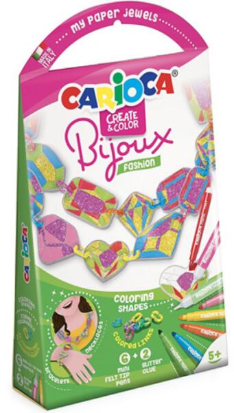 Bijoux Fashion ékszerkészítő kreatív játékszett - Carioca Hivatalos magyarországi forgalmazótól. Leírás: Papír alapú ékszereket készíthetnek a gyerekek ezzel a kreatív szettel, melyben mindent megtalálnak az elkészítéshez. A Carioca Bijoux Fashion készletben a kis medálokat kell kiszínezniük a kicsiknek a filctollak és a csillámragasztók segítségével, majd azokat a