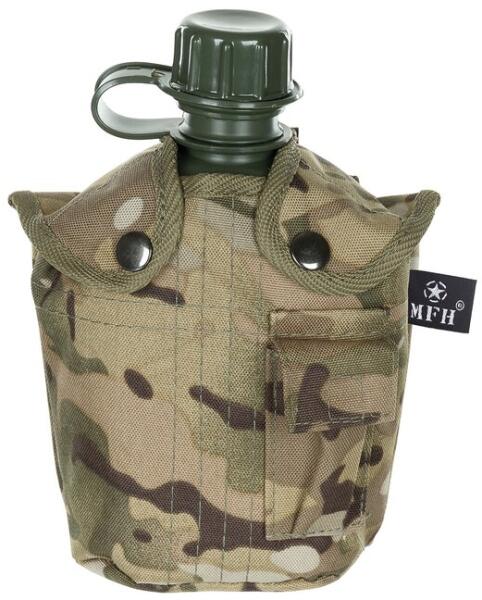 US műanyag kulacs, 1 l, fedő, művelet-camo, BPA mentes, csavaros kupakkalrögzítés a palacknyakonpárnázott fedél nyomógombokkalkis külső zseb tépőzárral és hurkapánttal2 tartókapocs az övre történő rögzítéshez, hátizsákokhoz stb. Méretek: kb. 13 x 21 x 8 cm (szélesség x magasság x mélység)Súly: