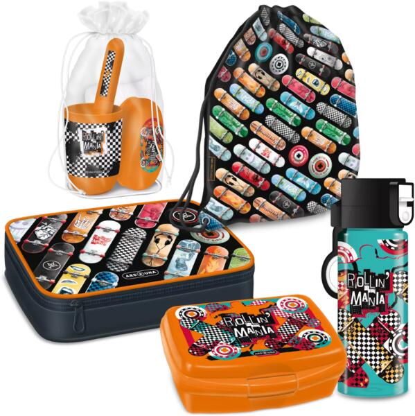 Ha a te fiad is rajong a gördeszkázásért, akkor ezt a csomagot szeretni fogja: A szett tartalma: Ars Una Rollin' Mania többszintes tolltartó Gördeszk ás mintával díszített tolltartó Ceruzatartók: 30 db Radír- és egyéb tartó: 4 db Extra: plusz zseb további írószereknek Méret: 155x225x45 mm Ars Una Rollin' Mania tornazsák Tornazsá k felül összehúzható zsinórral Görd
