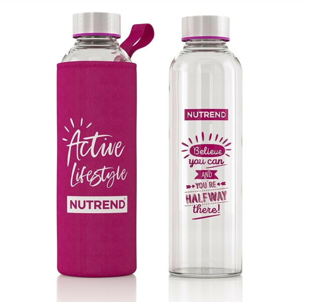 Nutrend üveg palack 500ml praktikus átlátszó kivitelezés, fém kupakkal. Rózsaszín hőszigetelővédő borítással. Üveg palackkal csökkentheted a szeméttermelést és a káros BPA-vegyületek felhalmozódását. Bemutatjuk a Nutrend Glass Bottle üveg palackot 500 ml kapacitással mindennapos használatra, legyen szó akár sportról, gyaloglásról vagy munkahelyről. Kifejezetten tar