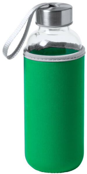 Üveg kulacs hordszíjjal és színes neoprén borítással. 420 ml. Nem alkalmas szénsavas italok tárolására.