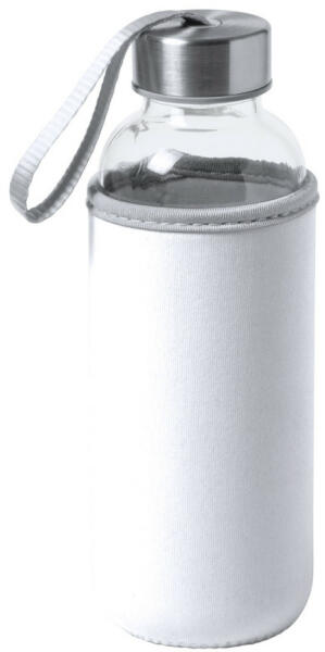 Üveg kulacs hordszíjjal és színes neoprén borítással. 420 ml. Nem alkalmas szénsavas italok tárolására.