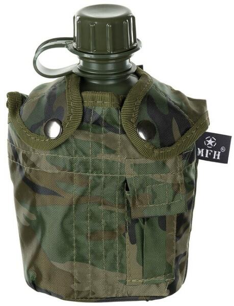 US műanyag kulacs, 1 l, fedő, woodland, BPA mentes, csavaros kupakkalrögzítés a palacknyakonpárnázott fedél nyomógombokkalkis külső zseb tépőzáras rögzítővel2 tartókapocs az övre történő rögzítéshez, hátizsákokhoz stb. Méretek: kb. 13 x 21 x 8 cm (szélesség x magasság x mélység)Súly: kb. 200