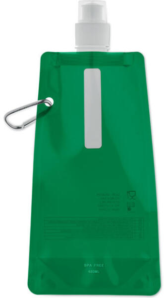 Összehajtható vizes palack BPA-mentes PET műanyagból. Alumínium karabinerrel. Űrtartalom: 480 ml. Szivárgásmentes.