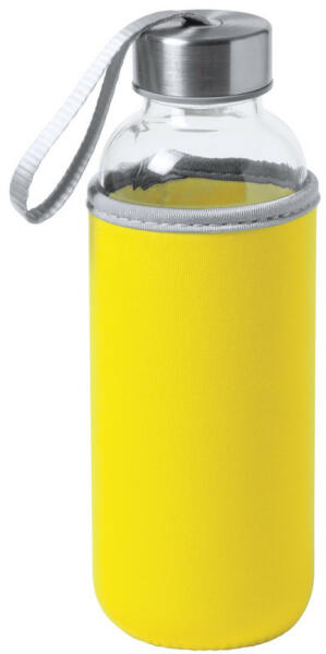 Üveg kulacs hordszíjjal és színes neoprén borítással. 420 ml. Nem alkalmas szénsavas italok tárolására.