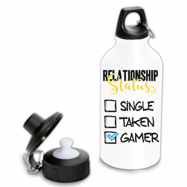 BPA-mentes RPET műanyag kulacs rozsdamentes acél kupakkal és hordszíjjal, 500 ml. Nem alkalmas szénsavas italok tárolására.
