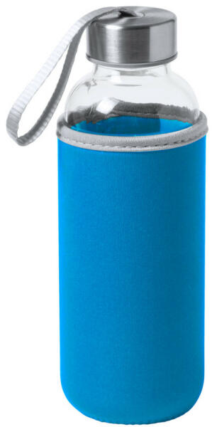 Üveg kulacs hordszíjjal és színes neoprén borítással. 420 ml. Nem alkalmas szénsavas italok tárolására.
