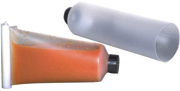 Újratölthető csövek mindenféle folyékony dologhoz. Ezeket tetszőlegesen gyakran lehet újratölteni. A töltés a teljesen kinyitott csövön keresztül, hátulról történik. A szorítórúd megbízhatóan lezárja a csövet. Kényelmesen kifejezhető a csavaros kupakon keresztül. Polietiléno kb. 5 cm,