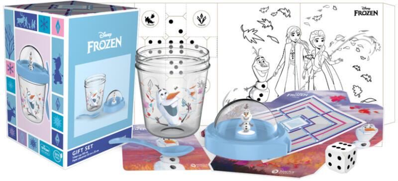 Disney Frozen, Disney Jégvarázs Olaf ajándék szettTartalma:- 350 ml pohár snack tartóval, kanállal és Elsa figurával(műanyag)- papír alátét 10x10 cm- társasjáték - színezhető kép