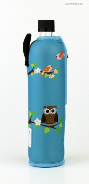 500 ml-es, DORAS (üvegpalack) világoskék színű, bagoly mintás neoprén huzattal Az üvegkulacs: Mérete: 26,3 x 7 cm, 500 ml űrtartalom Természetes anyagokból készült: homok, mészkő és nátrium-karbonát. Nem tartalmaz káros lágyítószereket, szerves vegyületeket vagy BPA-t. Az üvegpalackba 0°C – 80°C fok közötti hőmérsékletű folyadék tölthető. Forró italok esetén