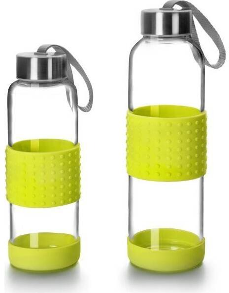 Praktikus üvegpalack zöld gumibordákkal és rozsdamentes acélfedéllel.