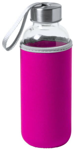 Üveg kulacs hordszíjjal és színes neoprén borítással. 420 ml. Nem alkalmas szénsavas italok tárolására.