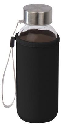 Átlátszó üveg kulacs, neoprén tartóban, záró fedéllel, hordszíjjal és 300 ml űrtartalommal, szivárgásmentes. Méret: o 5,8 x 17,2 cmEmblémázási méret: 5 x 8cm Emblémázását, feliratozását vállaljuk.