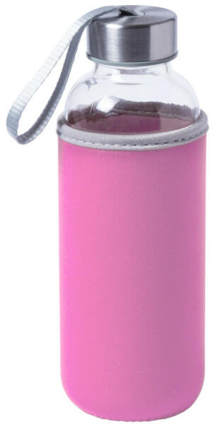 Üveg kulacs hordszíjjal és színes neoprén borítással. 420 ml. Nem alkalmas szénsavas italok tárolására.