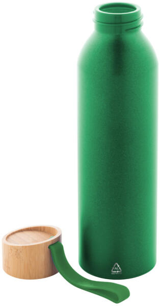 Újrahasznosított alumínium kulacs bambusz tetővel és hozzáillő színű szilikon hordszíjjal, 600 ml.
