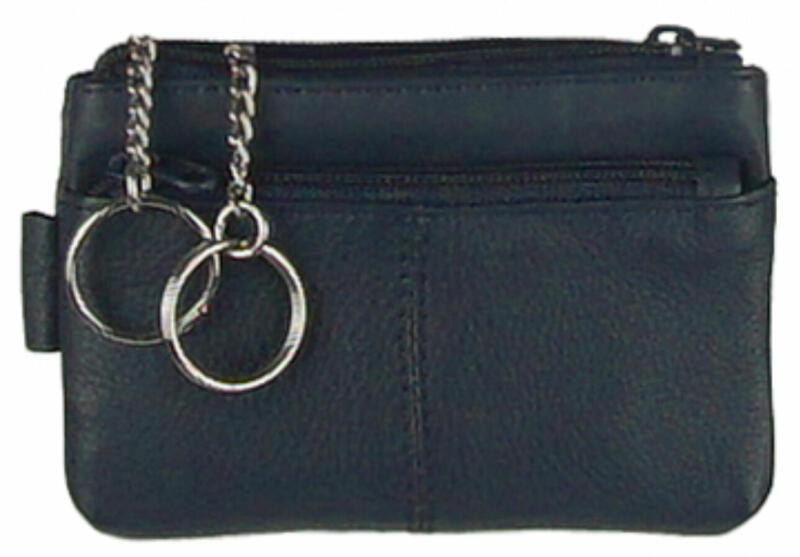 Puha sötétkék bőrből készült 2 részes kulcstartó. Kulcstartó része cipzárral zárható, amelyben két, fém lánccal rögzített kulcskarika található. Elején egy 5,5 cm magasan lévő cipzárral zárható, kulcstartó méretű lapos zseb helyezkedik el.