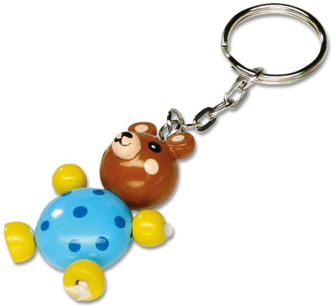 Színes, festett kedves kis fafigura maci lánccal rögzített kulcstartó karikával. Az állatkák lábai erősen rögzítettek biztonságos módon.
