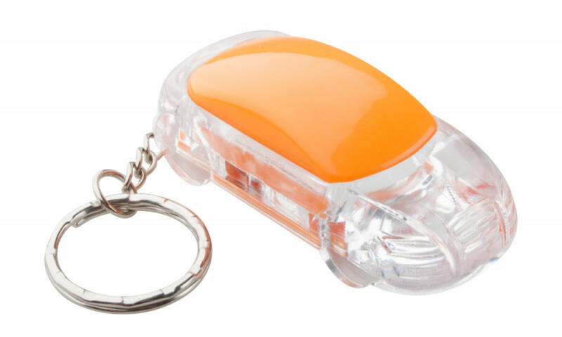 Autó formájú műanyag kulcstartó fehér LED fénnyel és fém kulcskarikával. Gombelemmel szállítjuk.