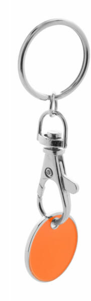 Fém bevásárlókocsi érme karabinerrel és kulcskarikával, melynek egyik oldala színes, másik oldalán pedig bevásárlókocsi logó található. Érme mérete: ø23×1,7 mm.