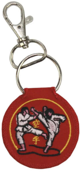 Kerek kulcstartó, mindkét oldalán hímzett karatés motívummal és praktikus karabinerrel. Kb 5 cm átmérőjű.