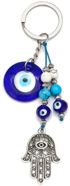 Vigye magával a védelmet minden utazás során ezzel a gyönyörű és spirituális jelentéssel bíró nazar védelmező kulcstartóval, amely autódíszként is tökéletesen használható! A Hamsa kéz, a nazar szem és a türkiz gyöngy egyesítésével ez az amulett harmóniát, békét és védelmet hoz a mindennapokba. A Hamsa kéz és a nazar szem együttesen őrzik Önt a negatív energ