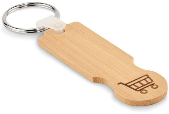Bambusz érmés kulcstartó Bambusz kulcstartó, bevásárlókocsi-érmével. A bambusz természetes anyag, színében, mintázatában és méretében esetenként eltérő lehet.