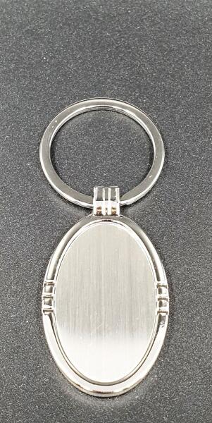 Gravírozható kulcstartó. Ovális alakú gravírozható kulcstartó, fekete papír dobozban. Anyaga: fém Mérete: kb. : 4,5 x 3 cm