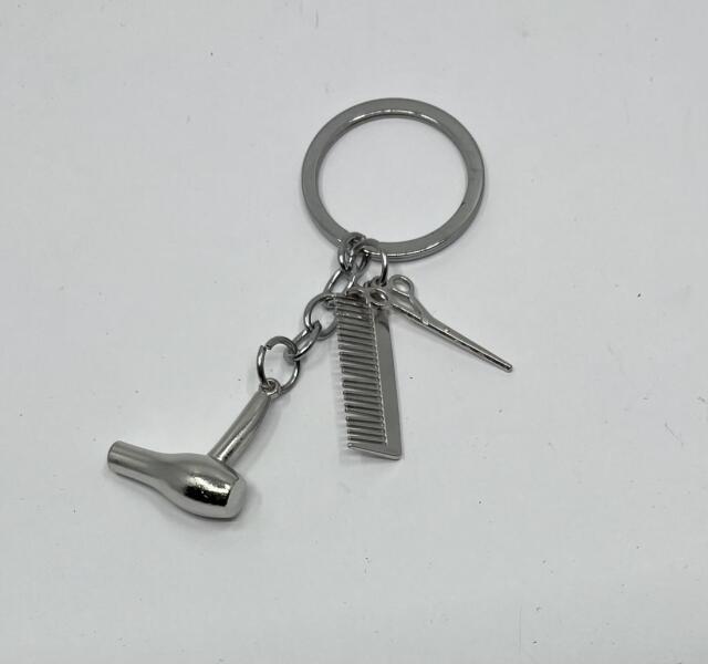 Kulcstartó fodrászoknak. Kedves ajándék fodrász barátainknak, ismerőseinknek ez a fésűt, hajszárítót és ollót formázó kulcstartó. Anyaga: fém Mérete a kulcskarikával együtt kb. 8 cm
