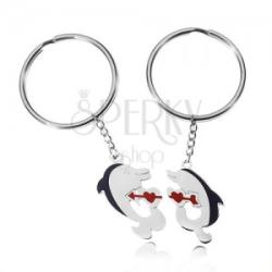 A delfineket ábrázoló kulcstartó szett matt fémes kivitelben készült. A delfinek szemét beágyazott cirkonkövek helyettesítik. A kulcstartók egymás tükörképei. Mindkét delfin átlőtt piros szívecskét tart, a nyíl két félre van osztva. Méret: 20 x 28 mmAz ár egy párra vonatkozik.