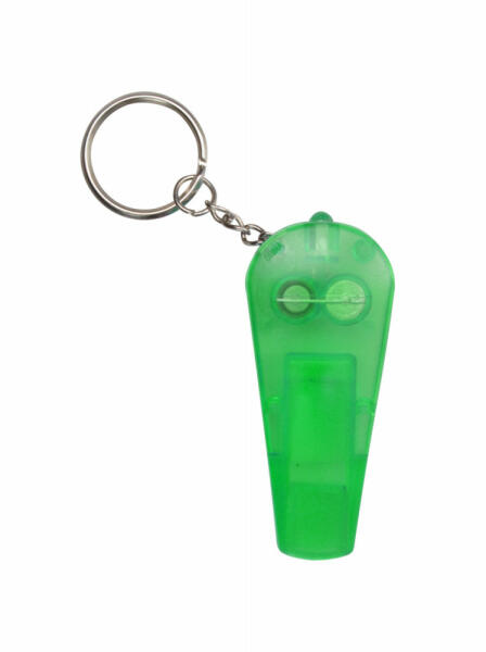 Műanyag, áttetsző síp kulcskarikával, mini lámpával, elemmel szállítjuk.