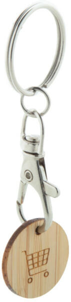 Fém karabineres kulcstartó bambusz bevásárlókocsi érmével. Érme mérete: ø23×2 mm.
