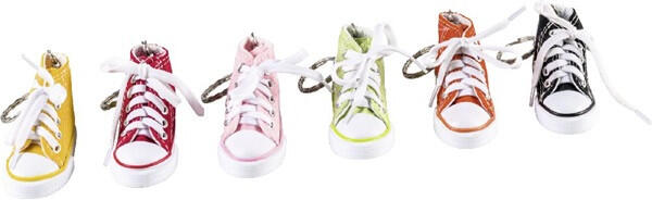 Brunnen Sportcipő kulcstartó Tornacipő alakú kulcstartó hat színben, citromsárga, narancssárga, pink, piros, zöld, fekete. Fém lánc és karika. A szín nem választható.