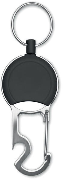 Visszahúzható kártyatartó Visszahúzható bérlet- vagy belépőkártya tartó ABS-ből, csíptetővel, kulcstartóval és üvegnyitóval.
