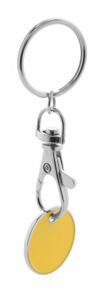 Fém bevásárlókocsi érme karabinerrel és kulcskarikával, melynek egyik oldala színes, másik oldalán pedig bevásárlókocsi logó található. Érme mérete: ø23×1,7 mm.