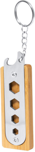 Bambusz és rozsdamentes acél multifunkciós kulcstartó üvegnyitóval és 4 db hatszögletű csavarkulcs nyílással.
