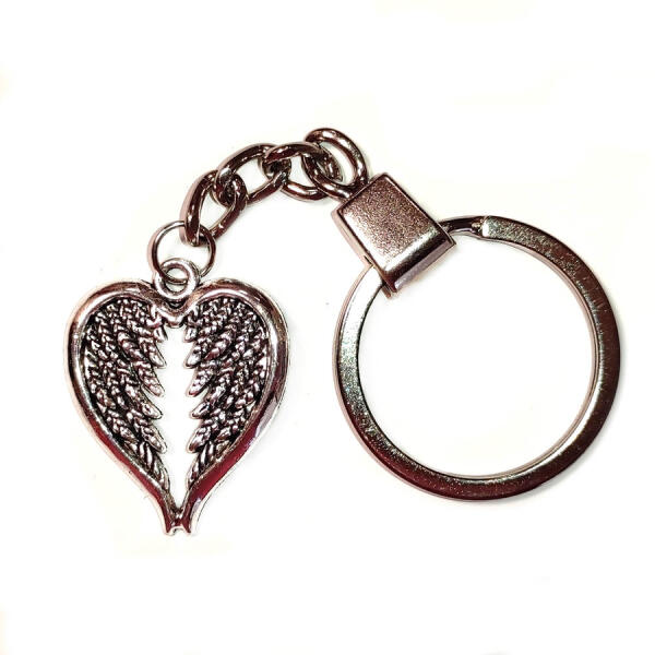 Angyalszárny Szív kulcstartó. Paraméterek: Medál mérete: kb 2,7 cm, anyaga fémötvözet. Kulcstartó karika típus eltérhet a képen láthatótól, készlet szerint küldjük. Ékszeralapok anyaga: rozsdamentes acél.
