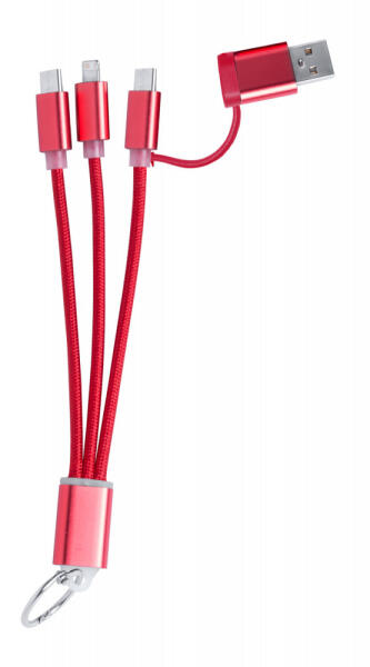 Alumínium USB töltőkábel kulcstartóval. Mikro USB, USB-C és Lightning csatlakozókkal és 2 USB bemenettel.