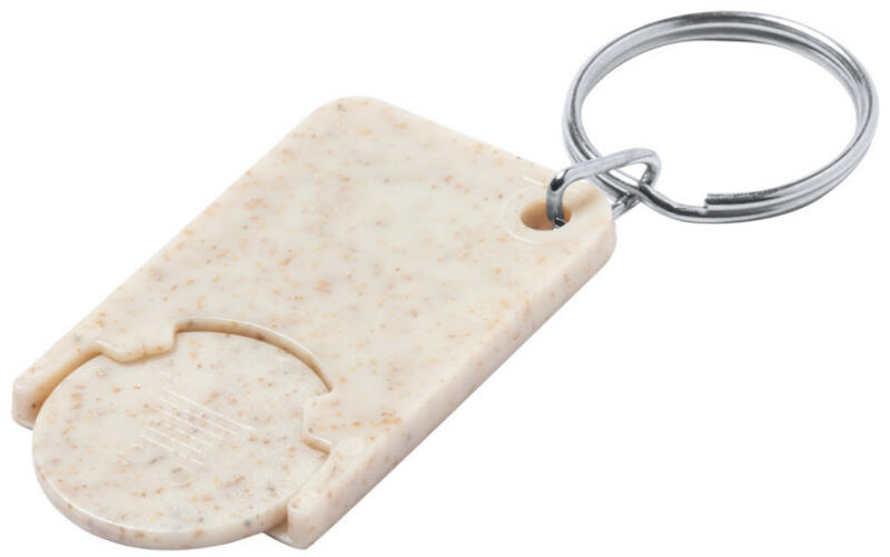 Ökológiai búzaszalmából és ABS műanyagból készült bevásárlókocsi érme, fém kulcstartóval.